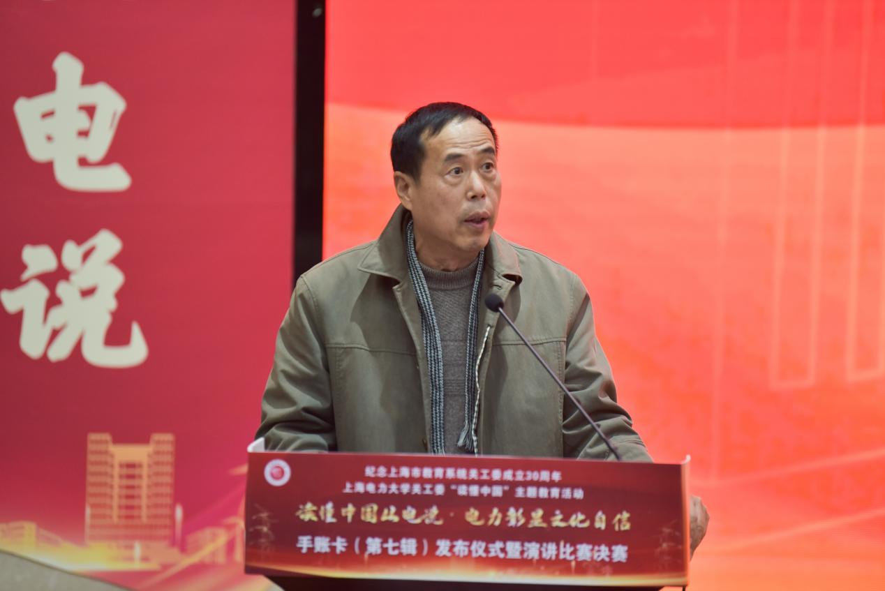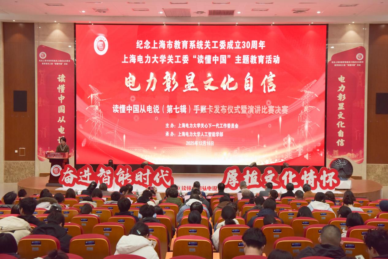 1216日下午,由校关工委主办、人工智能学部承办的“读懂中国从电说·电力彰显文化自信”手账卡(第七辑)发布暨演讲比赛决赛在临港校区学术楼117会议室举办。市教卫工作党委老干部处处长、教育系统关工委秘书长于美华,市教育系统关工委驻会副主任金勤明,校党委书记、关工委主任宋来,校党委副书记、副校长、关工委执行主任朱克勇,校关工委常务副主任石奇光,校关工委副主任韦钢,校党委组织部部长赵建明,校党委宣传部部长石笑寒,校退休党委书记、关工委秘书长徐广新,校学工部部长、校关工委副秘书长陈姗姗,人工智能学部党委书记、关工委主任刘莉以及校团委、校关工委老同志代表、各二级学院党委副书记、教师代表和学生代表等三百余人参加,活动分为手账卡发布启动仪式和演讲比赛决赛。手账卡发布启动仪式由人工智能学部副书记齐永晓主持。