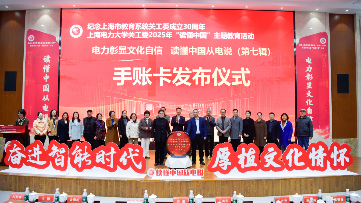 在全场热烈的掌声中,宋来和于美华为手账卡揭幕,上海电力大学“读懂中国从电说·电力彰显文化自信”手账卡(第七辑)正式发布。