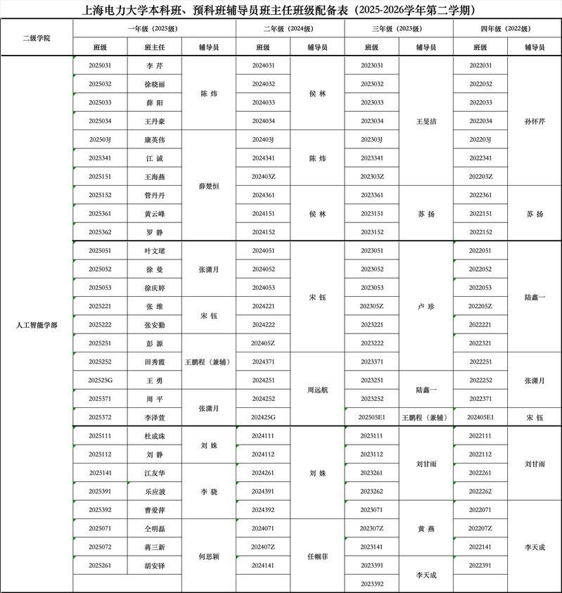 上海电力大学本科班、预科班辅导员班主任班级配备表(2025-2026学年第二学期)