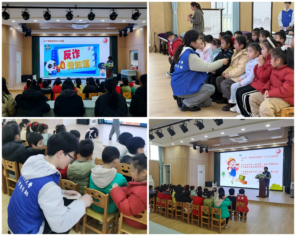 签约仪式后,上海电力大学“E路领航”学生志愿者团队为幼儿园大班的小朋友们带来了一场以“安全防诈”为主题的AI互动小课堂。志愿者们巧妙结合人工智能技术应用场景,用动画视频、智能语音互动等形式,生动讲解如何识别“假冒熟人电话”“虚假退款链接”等常见诈骗手段,引导孩子们在趣味体验中提升安全意识和科学素养。